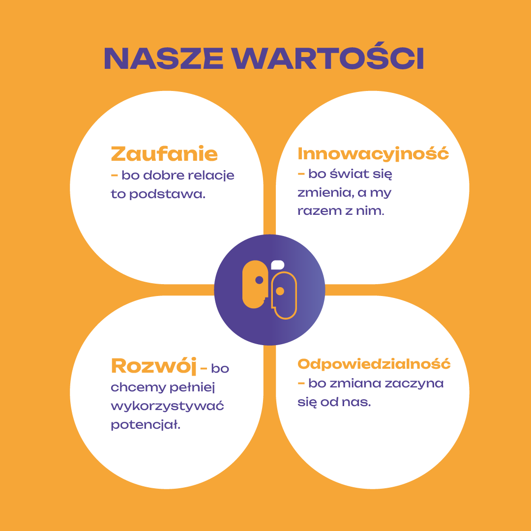 Innowacyjność - Jesteśmy otwarci na nowości, staramy się wprowadzać nowe rozwiązania, pomysły i technologie, które pozwolą nam osiągnąć nasze cele w efektywny sposób. Wspieramy rozwój innowacyjnych projektów i inicjatyw, a także angażujemy się w działania, które mają na celu popularyzację wiedzy i umiejętności z zakresu innowacyjności.